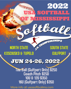 Championship season is upon us. For the convenience of teams, we have separate tournaments in the northern and southern parts of the state. The north has 8U, 10U and 12U divisions. The South has 6U, 8U, 10U, 12U & 16U. Teams are free to choose whatever location they would like to play at including Gulfport, Kosciusko or Tupelo.
