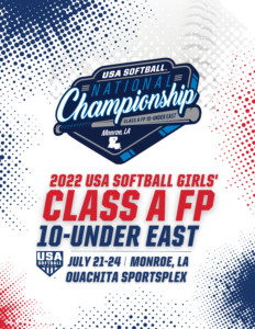 The 10 & Under Class A Fast Pitch National Championship will be held in Monroe, LA on July 21-24, 2022. This is a great opportunity for 10U teams from our area to compete in national tournament. National Tournaments are so much more than just another tournament. For more information, please go to 10U Class A East National Championship.